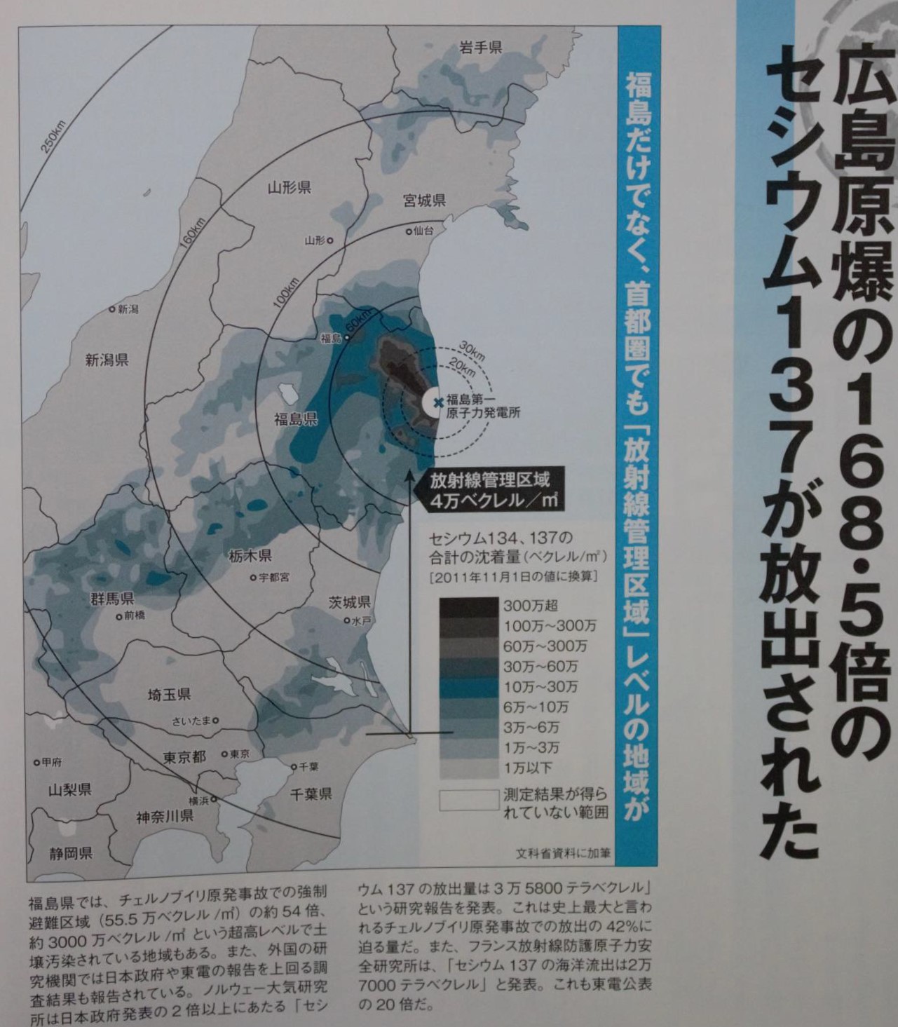 セシウム134,137 の合計沈着量(ベクレル ㎡)「 2011 年 11 月 1 日の値に換算」国内法で放射線管理区に相当する 4 万ベクレル ㎡の汚染が福島県だけでなく首都圏にも存在する。