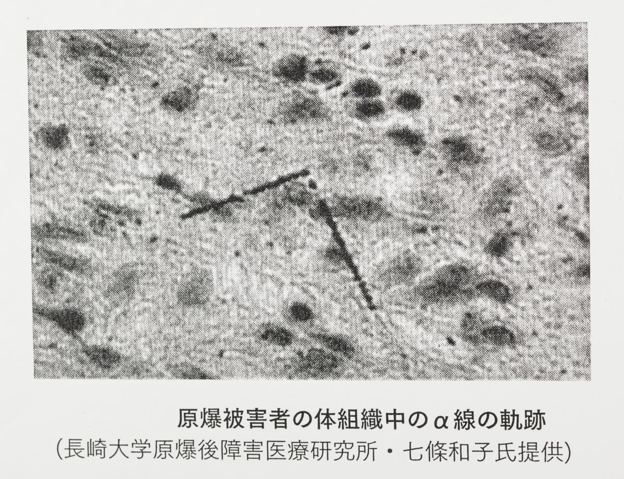 被曝者の腎臓の細胞からアルファ線が放出されている。(黒い2本の線)約70年を経た現在でも臓器内部で放射線源が放射線を発し続けている証拠、内部被曝そのものである。(腎臓の中でプルトニウムがアルファ線を放射している軌跡)