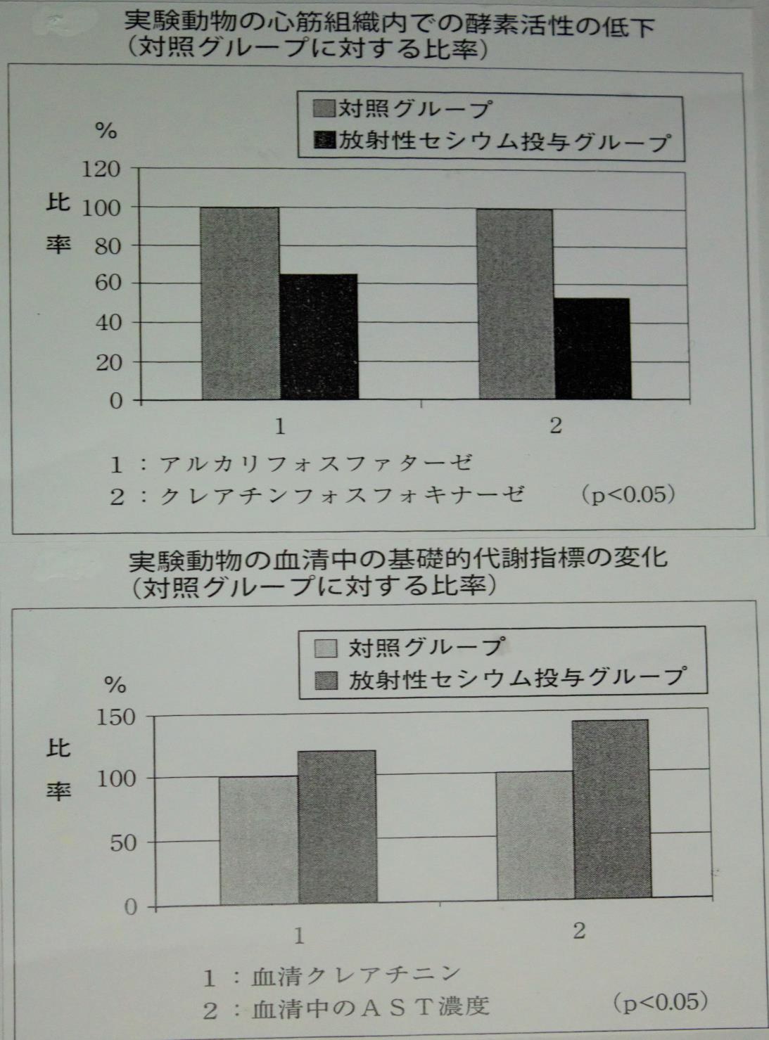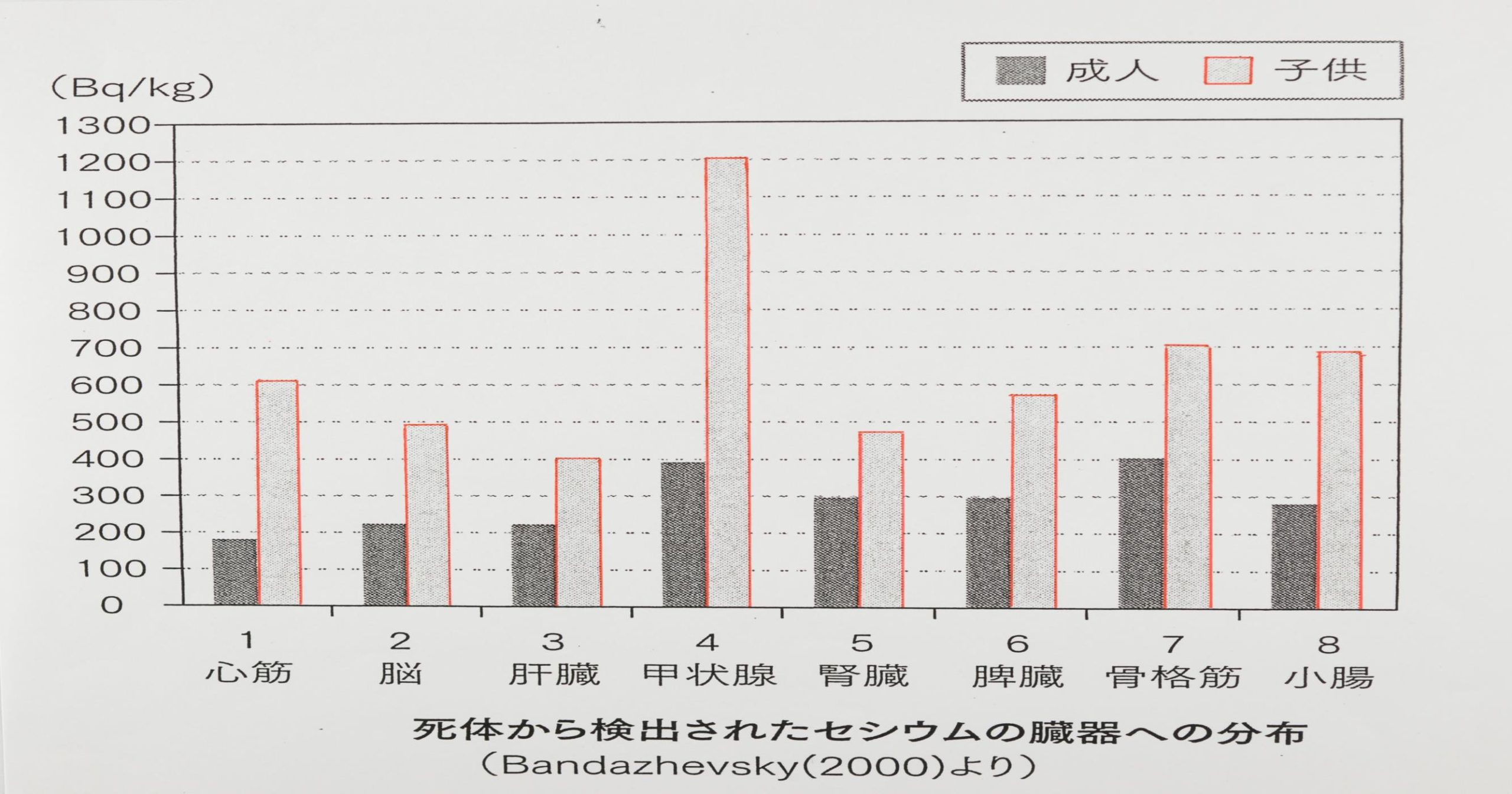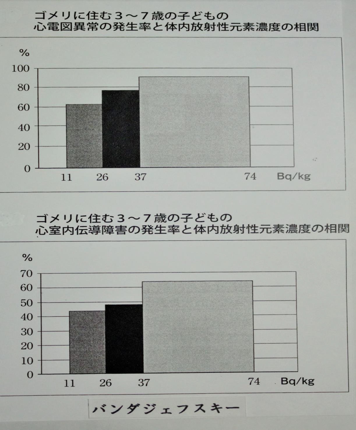バンダジェフスキーはゴメリ医科大学病院で亡くなった多数の患者を解剖し、心臓、腎臓、肝臓等に蓄積したセシウム 137 の量と各臓器の細胞組織の変化との関係を調べました。更に臨床研究と動物実験と併せて、体内のセシウム 137 による被曝は低線量でも危険であるとの結論に達した。