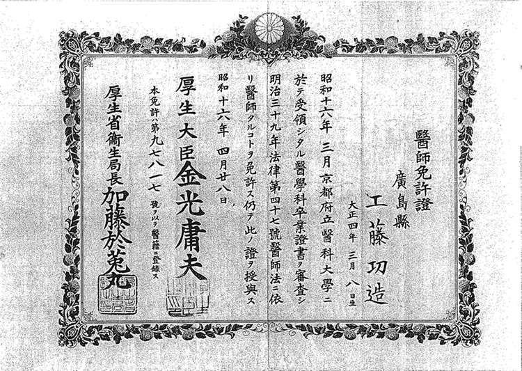 父は昭和十六年三月京都府立医科大学を卒業しました。明治三十九年に医師法が施行され、医師の免許資格を積極的に規定し、医師となるには一定の資格を有し内務大臣の免許を受けることとされました。その資格は帝国大学医学科又は官立・公立もしくは文部大臣の指定した私立医学専門学校の卒業者に限られました。昭和十六年四月二十八日に交付された医師免許証のコピーです。