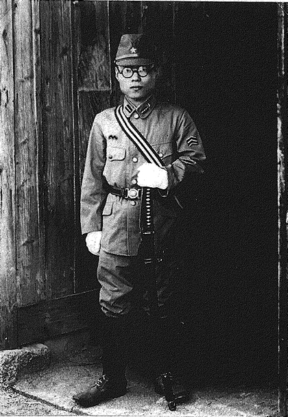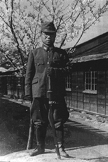陸軍少尉に任官を命じられ服装は三年式軍衣袴で桜花を背景に撮影