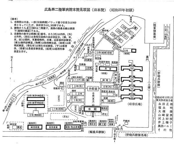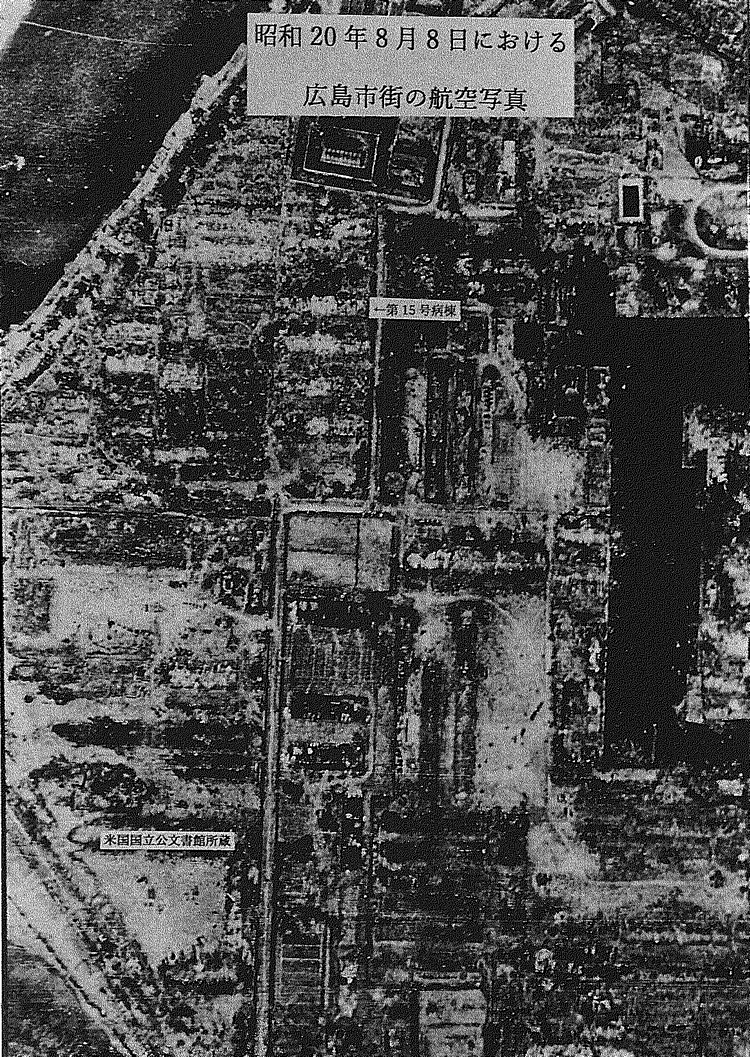 昭和二十年七月二十五日の高度8500mに於ける広島市街の軍用施設、 米軍にて航空写真が撮られていました。 広島第二陸軍病院本院は太田川畔沿いの爆心地から北西800mの距離に位置していました。