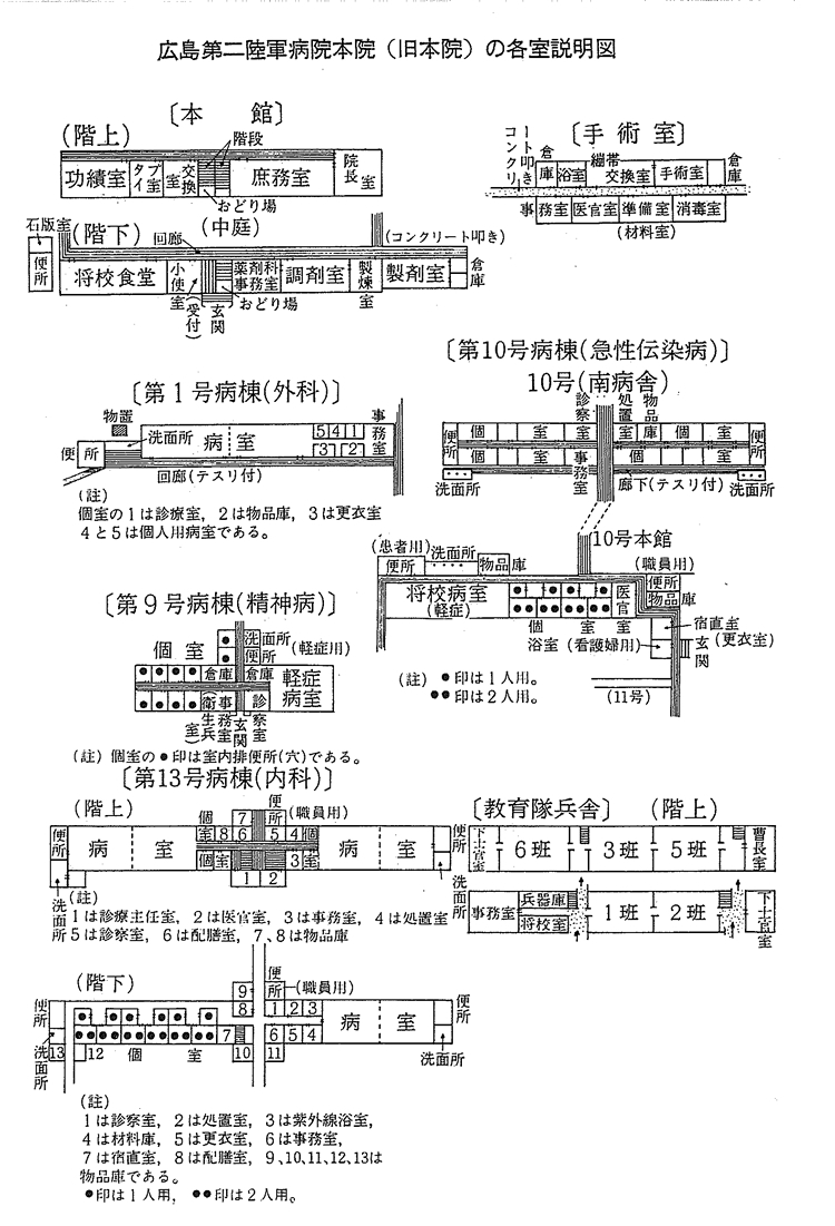 広島第二陸軍病院の各室説明図です。第13号病棟も第15号病棟も造りは同じでした。父は第15号病棟階下の処置室に於いて朝礼の為に看護婦14名が整列を終えた頃、原爆炸裂により被曝しました。
