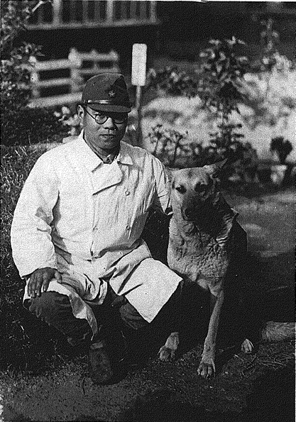 この写真には「昭和十九年五月中旬第八号病室中庭二於テ愛犬ヂョンヲ連レテ」との説明文が書いてありました。何故敵国語であった英語名で「ヂョン」と呼んでいたかは不明です。セパード犬ならドイツ語でハンスかペーターと呼称すると思うのですが!